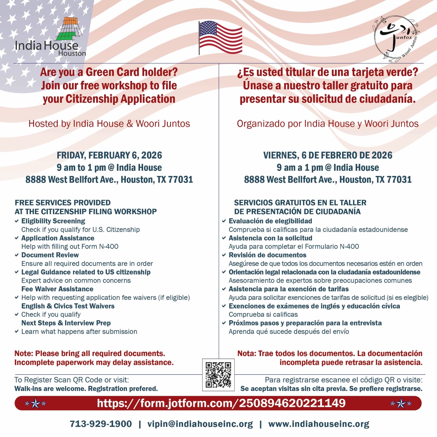 India House Houston organiza está sesión informativa gratuita para la obtención de la ciudadanía estadounidense. En el taller, se explicarán los beneficios de la ciudadanía estadounidense, los requisitos para ser elegidos y más. Se pide traer todos los documentos correspondientes. Más información en la web.