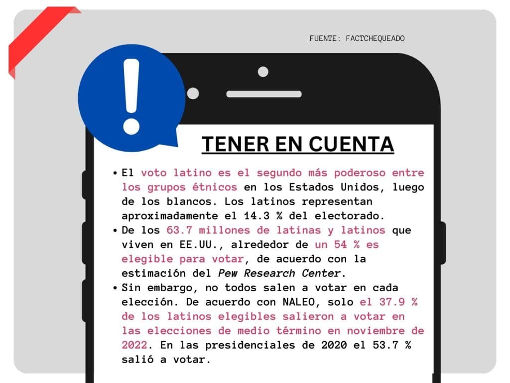 De acuerdo con la Asociación Nacional de Latinos Electos y Designados (NALEO), en las elecciones legislativas de 2022 solo votó el 37.9 % de los latinos elegibles. La cifra de votantes no hispanos que salieron a votar en esa elección fue de 54.4 %.