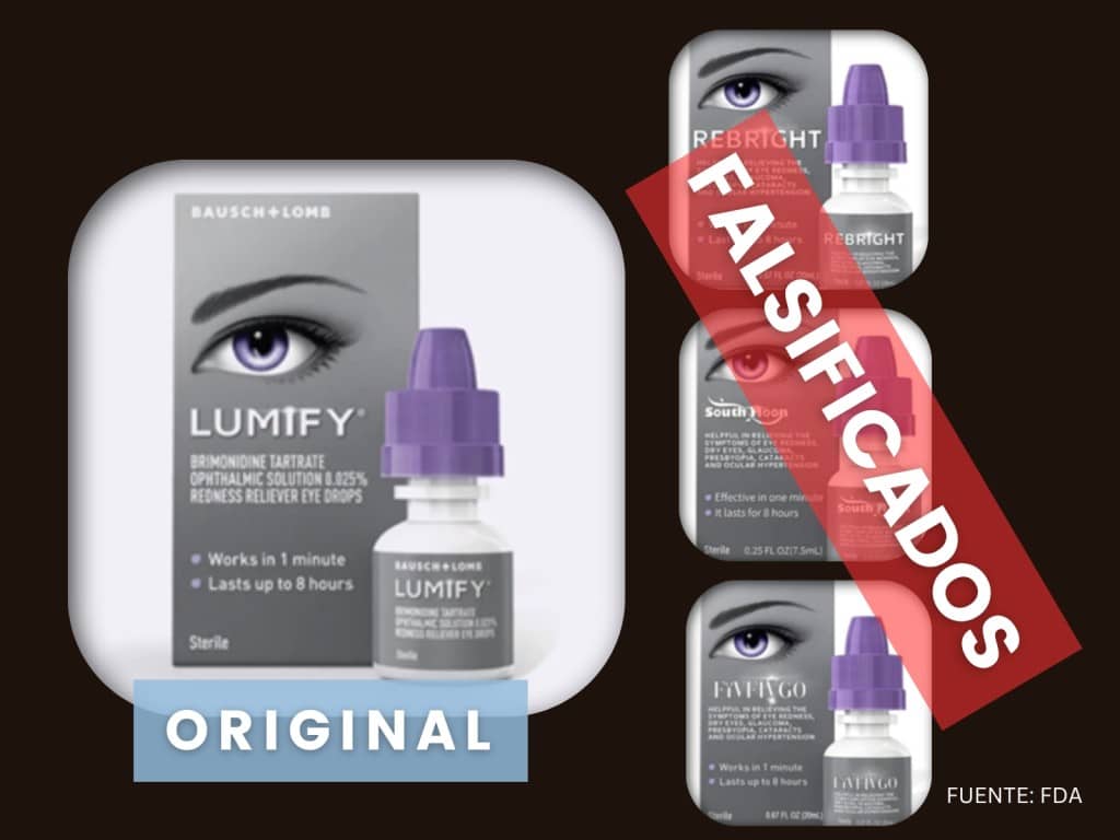 Estos son productos falsificados que imitan a las gotas para los ojos Lumify de la marca Bausch + Lomb, un producto de venta libre aprobado para aliviar ciertas infecciones en los ojos, según la agencia.
