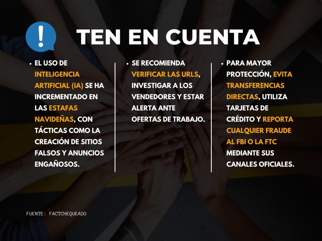 En ciudades como Miami y Pittsburgh se reporta un aumento de las estafas en las fiestas decembrinas que utilizan IA para quedarse con tu dinero o información personal, según el FBI y el Better Business Bureau (BBB). El estado de Nueva York también alerta sobre las estafas que utilizan IA para crear sitios web falsos o para generar imágenes de productos que no son los mismos que envían a los compradores.