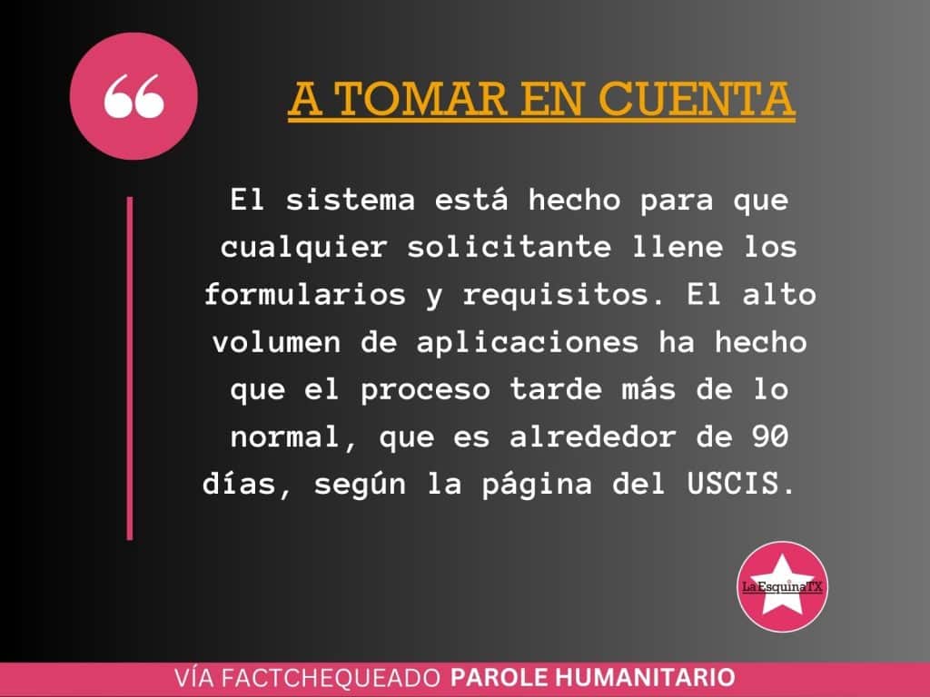 Recuerde que la petición de parole humanitario es gratis y el tiempo de espera es diferente para todos los solicitantes. El USCIS dice que los casos toman alrededor de 90 días, pero pueden ser mucho más que eso debido al “alto interés en este proceso”. A partir del 17 de mayo, la mitad del total mensual de los casos serán revisados aleatoriamente mientras que la otra mitad será en orden de llegada, indicó el USCIS.