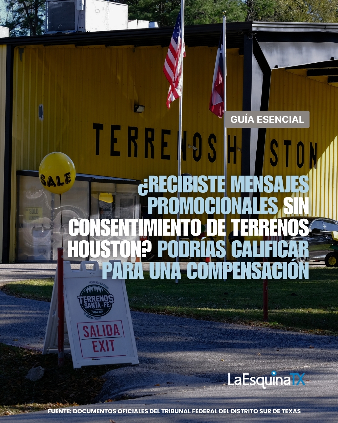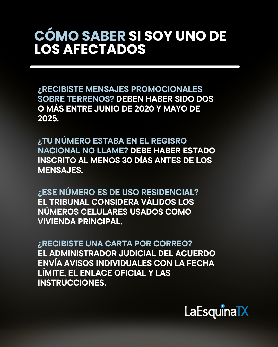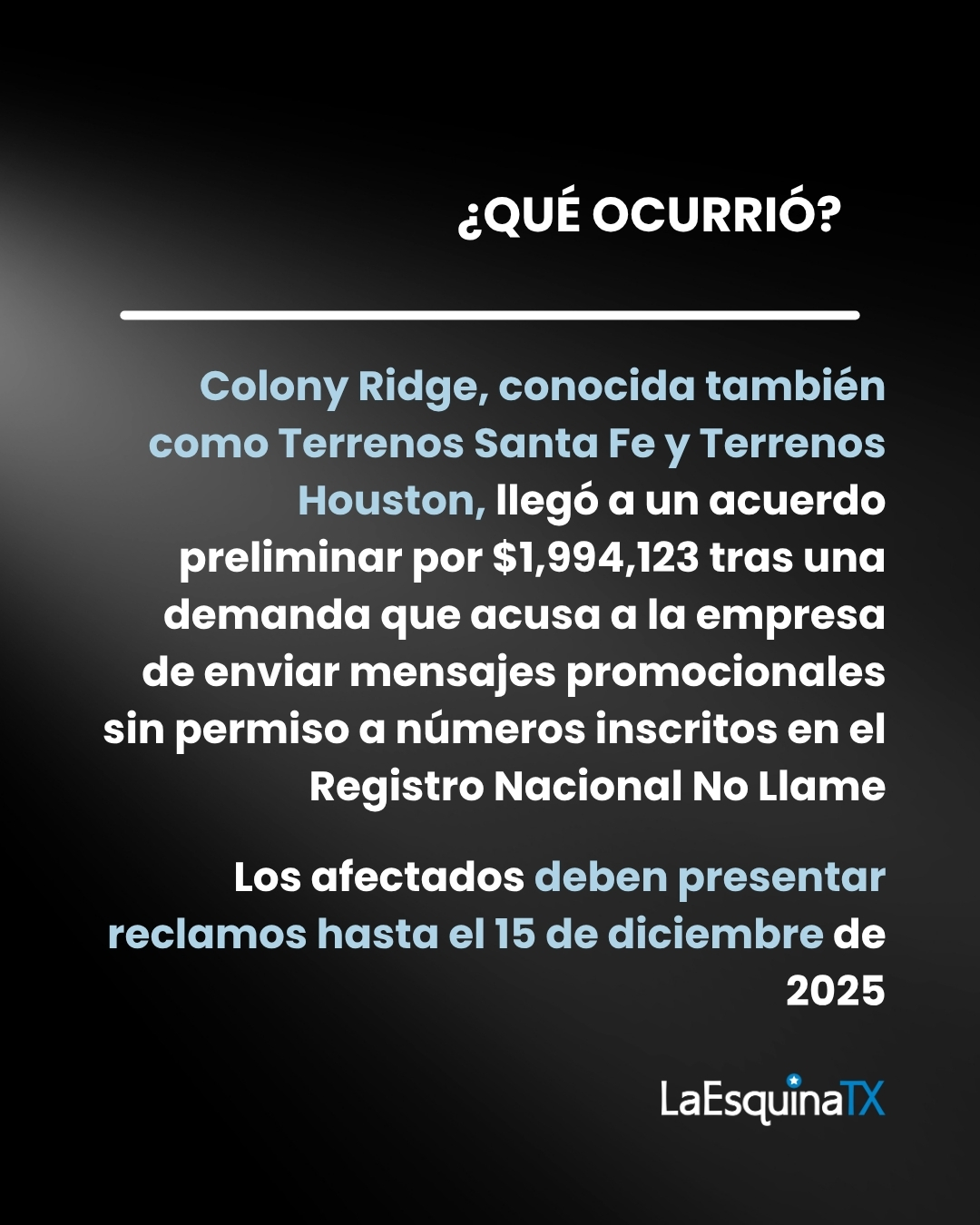 Los consumidores que recibieron mensajes promocionales sin consentimiento de Terrenos Santa Fe o Terrenos Houston tienen hasta diciembre de 2025 para presentar un reclamo y acceder a pagos de entre mil y dos mil dólares, derivados del acuerdo preliminar en la demanda colectiva contra la empresa Colony Ridge Development.