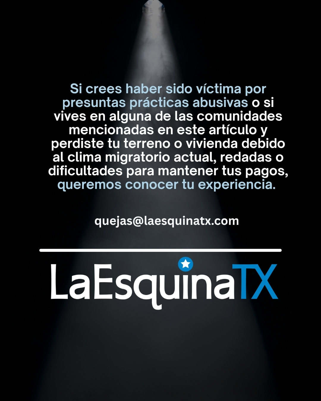 Si crees haber sido víctima por presuntas prácticas abusivas o si vives en alguna de las comunidades mencionadas en este artículo y perdiste tu terreno o vivienda debido al clima migratorio actual, redadas o dificultades para mantener tus pagos, queremos conocer tu experiencia. Comunícate con La Esquina TX para compartir tu caso de forma confidencial y aportar a nuestra cobertura en curso.