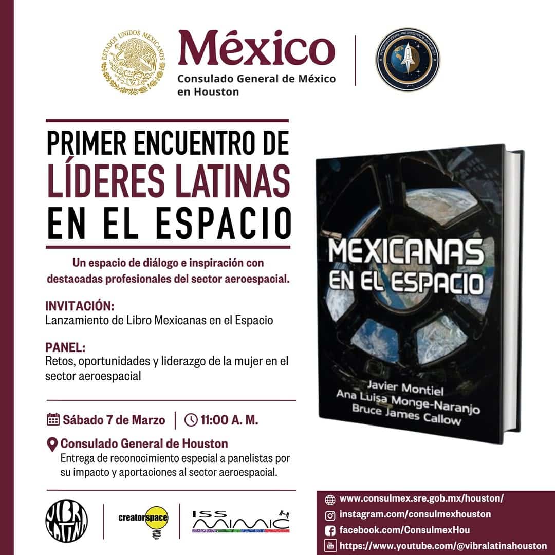 El Consulado General de México en Houston será sede del Primer Encuentro de Líderes Latinas en el Espacio, un con profesionales del sector aeroespacial que incluye la presentación del libro Mexicanas en el Espacio y un panel sobre retos, oportunidades y liderazgo de las mujeres en esta industria. El evento se realizará el sábado 7 de marzo, a las 11:00 a.m., e incluirá la entrega de reconocimientos a las panelistas por su impacto y aportaciones al sector.