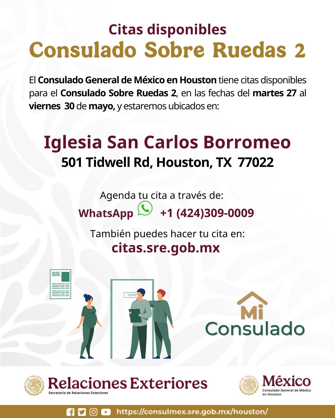 El Consulado General de México en Houston invita a la comunidad a participar en una nueva edición del Consulado Móvil entre el 27 al 30 de mayo. Podrás tramitar tu matricula consular, INE, actas de nacimiento o renovar tu pasaporte.
