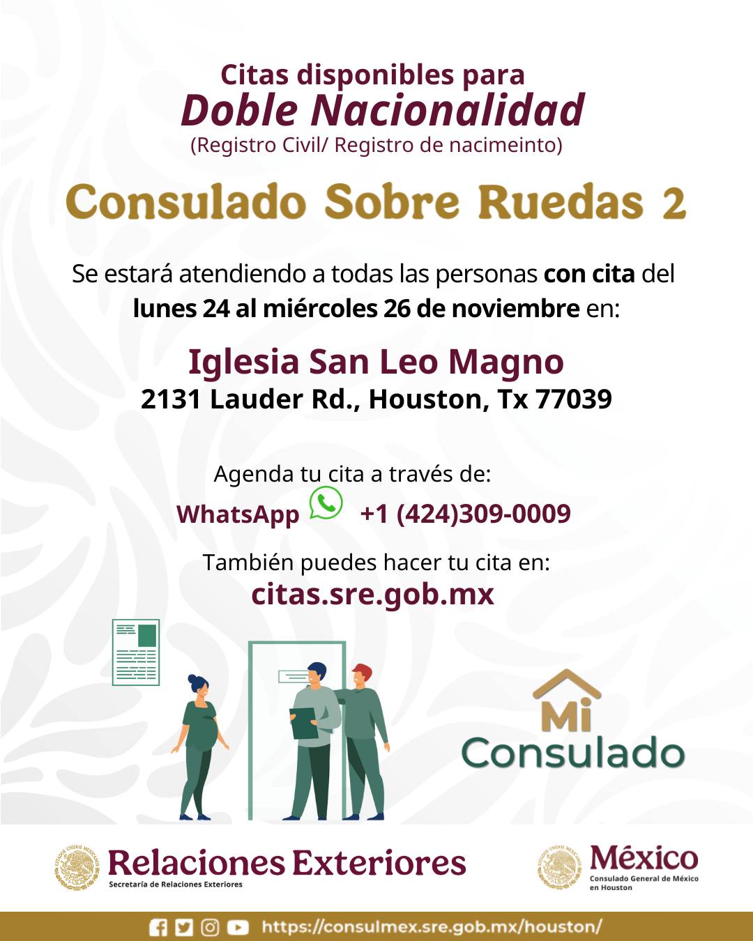 El Consulado General de México en Houston invita a la comunidad a participar en una nueva edición del Consulado sobre ruedas entre el lunes 24 y miercóles 26 de noviembre de 2025. Para trámite de Registro Civil (Doble nacionalidad).