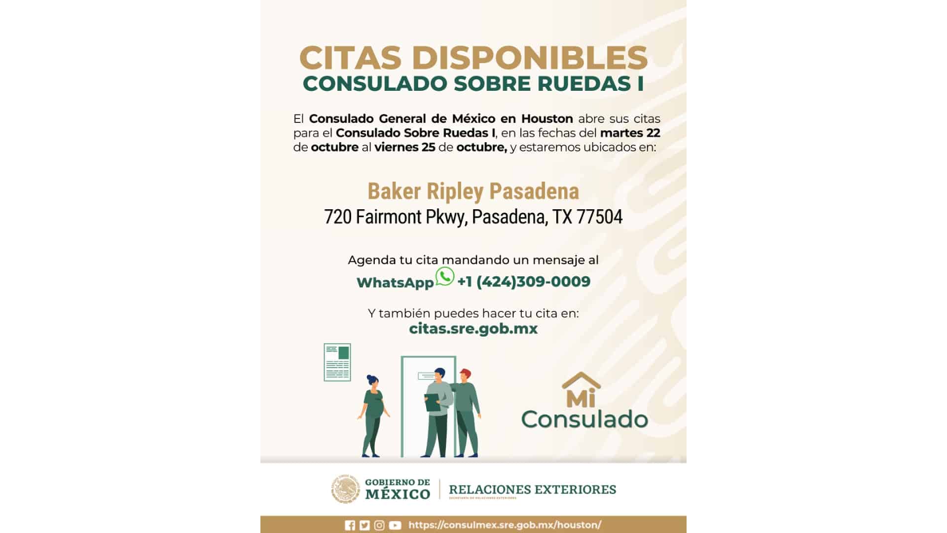 Las unidades Sobre Ruedas del Consulado General de México en Houston ofrecerán servicios de documentación: pasaportes, copias certificadas de actas de nacimiento, matrimonio y defunción, así como credenciales para votar del INE con CITA.