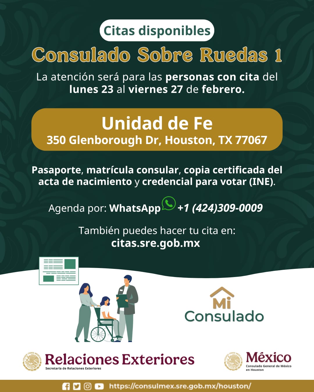 El Consulado General de México en Houston invita a la comunidad a participar en una nueva edición del Consulado sobre ruedas entre el 23 al 27 de febrero a las personas con cita. Podrás atender trámites de pasaporte, matrícula consular, INE y copia certificada de acta de nacimiento.