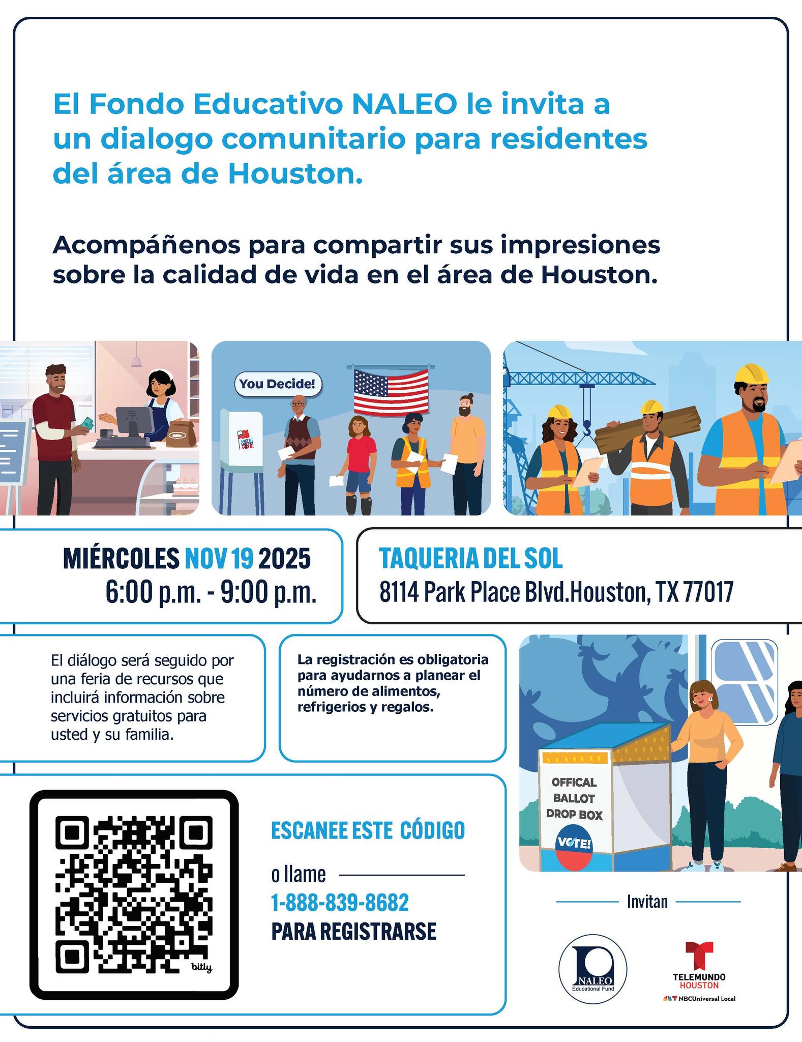 El Fondo Educativo NALEO invita a un diálogo comunitario y conocer sus impresiones sobre la calidad de vida en Houston. El evento contará con una feria de recursos que incluirá información sobre servicios gratuitos. Registro previo obligatorio.