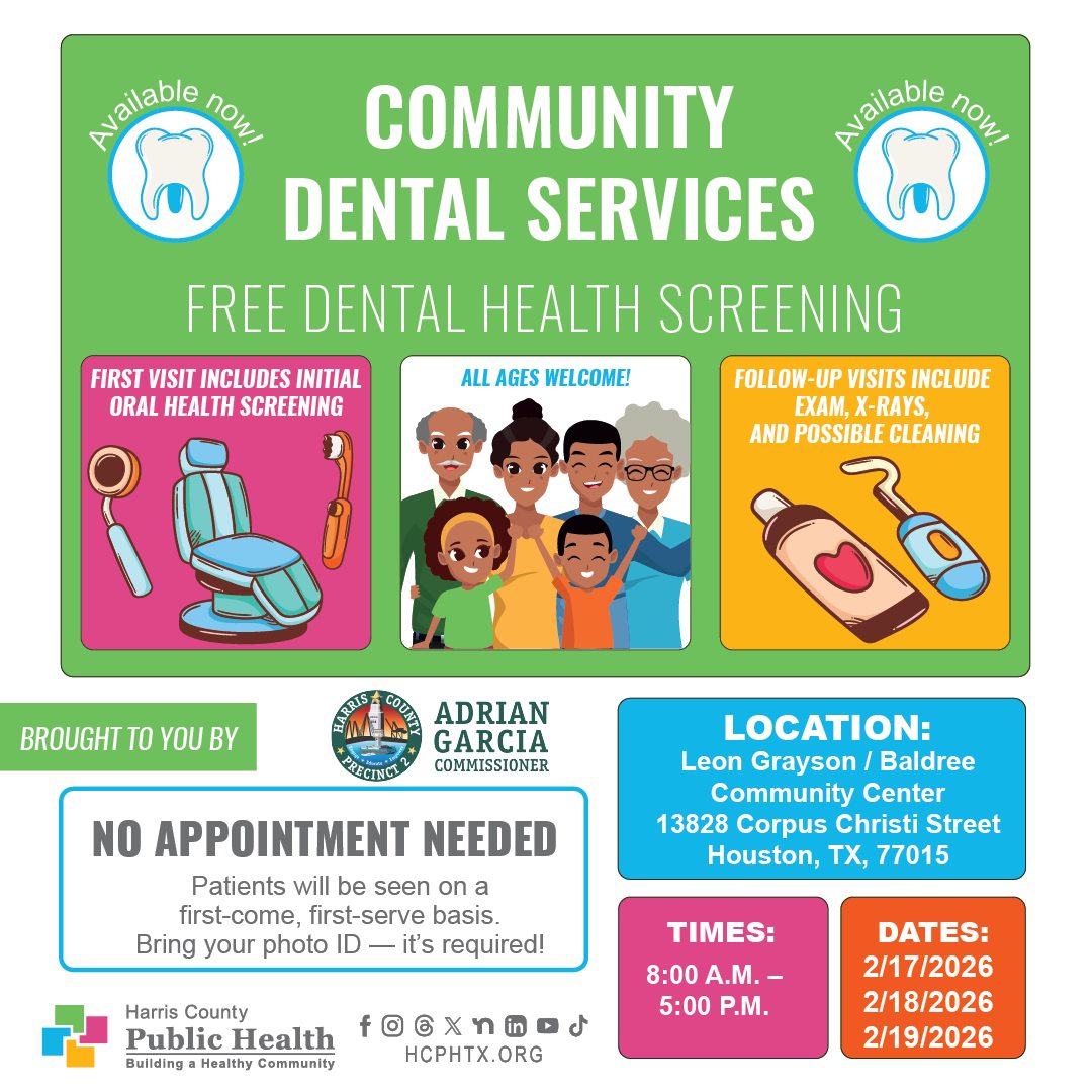El Centro Comunitario Leon Grayson / Baldree ofrecerá evaluaciones dentales gratuitas del 17 al 19 de febrero de 2026, en un esfuerzo de salud comunitaria impulsado por el Precinto 2 del Condado de Harris; la atención se brindará de 8:00 de la mañana a 5:00 de la tarde, con cierre de 12:00 a 1:00 por almuerzo, en las en 13828 Corpus Christi Street, Houston, TX 77015.