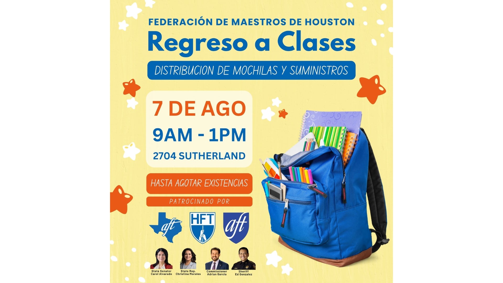 Asiste al evento que está organizando la Federación de Maestros de Houston para obsequiar mochilas y útiles escolares hasta agotar stock.