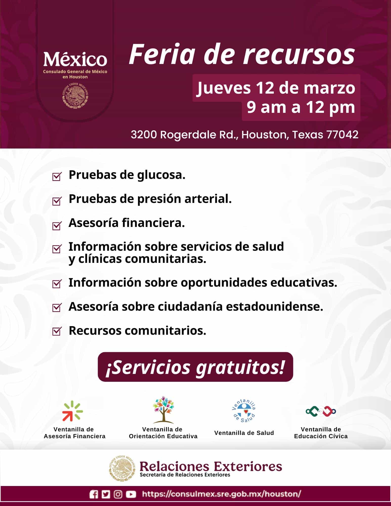 El Consulado General de México en Houston invita a la comunidad a participar en la Feria de Recursos, un espacio informativo donde se ofrecerán servicios gratuitos y orientación en temas de salud, educación, finanzas, ciudadanía y recursos comunitarios.