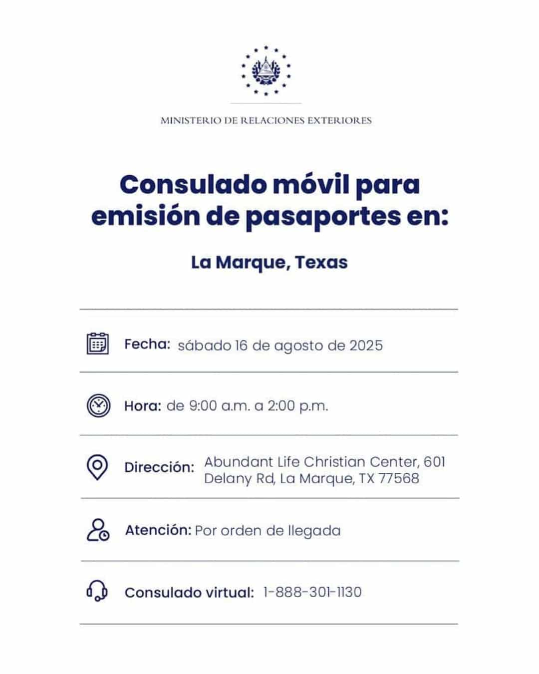 El Consulado de El Salvador en Texas invita a los nacionales a participar en este Consulado Móvil, donde se podrán tramitar pasaportes por primera vez, solicitar una renovación o, en caso de pérdida, una reposición. No es necesario registrarse, pero se atenderá por orden de llegada.