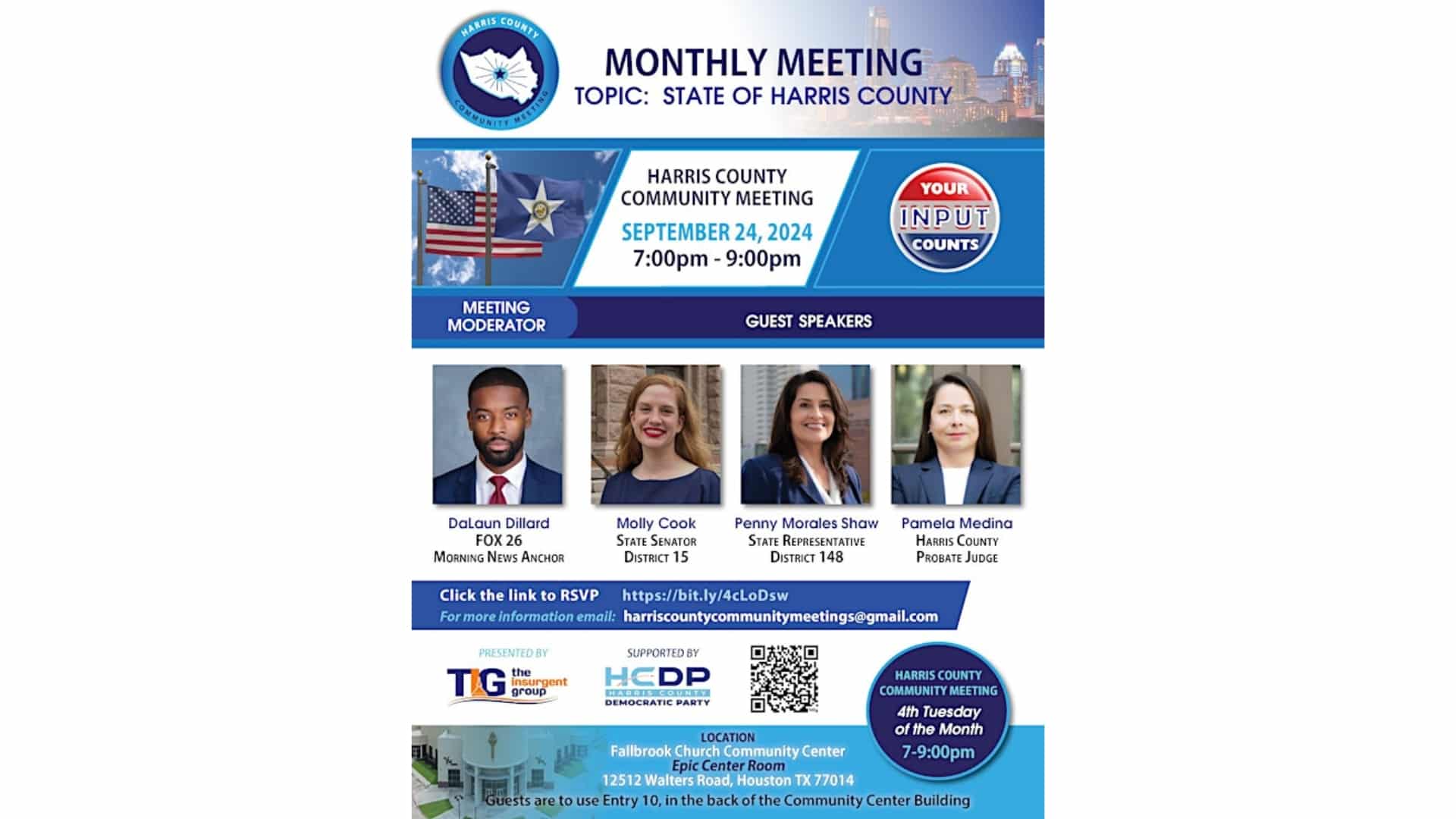 Asiste a la reunión comunitaria del condado Harris, que se realiza cada mes, para discutir los problemas locales y encontrar soluciones en comunidad.