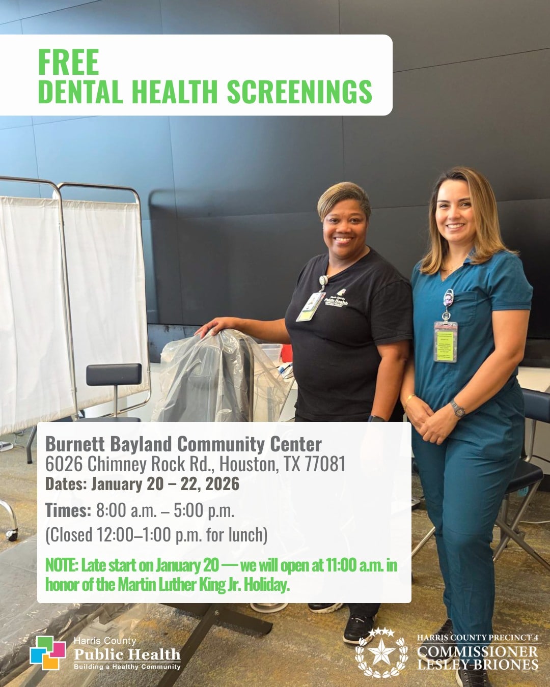 El Departamento de Salud Pública del Condado Harris invita a la comunidad a participar de revisiones dentales gratuitas. El servicio incluye revisión oral, exámenes de rayos X y limpieza dental. Personas de todas las edades serán atendidas.