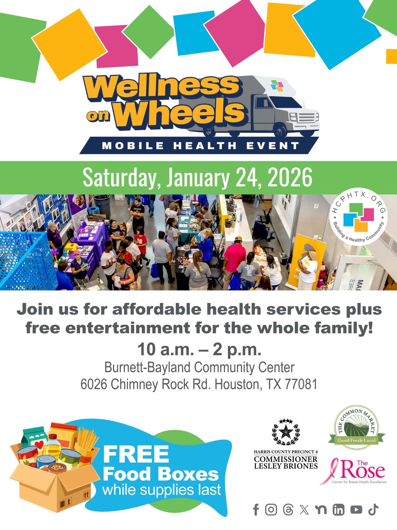 El Departamento de Salud Pública del Condado Harris invita a la comunidad a otro evento relacionado a la salud: Wellness on Wheels. Habrá información sobre servicios dentales, atención clínica, exámenes de prevención de ETS y, además, música en vivo y talleres de arte para toda la familia.