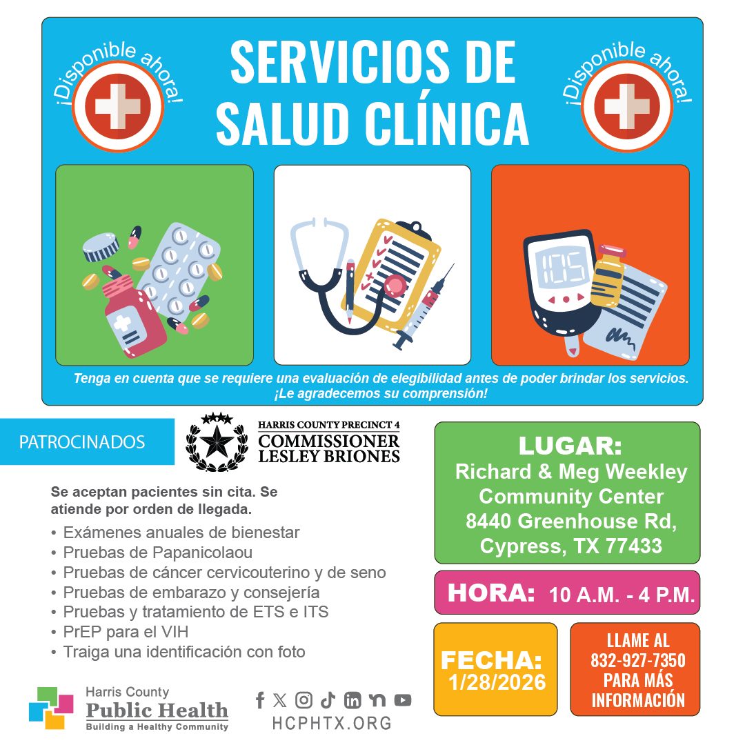 El Departamento de Salud Pública del Condado Harris invita a la comunidad a participar de una nueva edición de los Servicios de Salud Clínica. Entre los servicios que se brindarán se encuentran las pruebas de papanicolaou, pruebas de cáncer de seno, pruebas de embarazo, consejería y demás. Se urge llevar una identificación consigo.