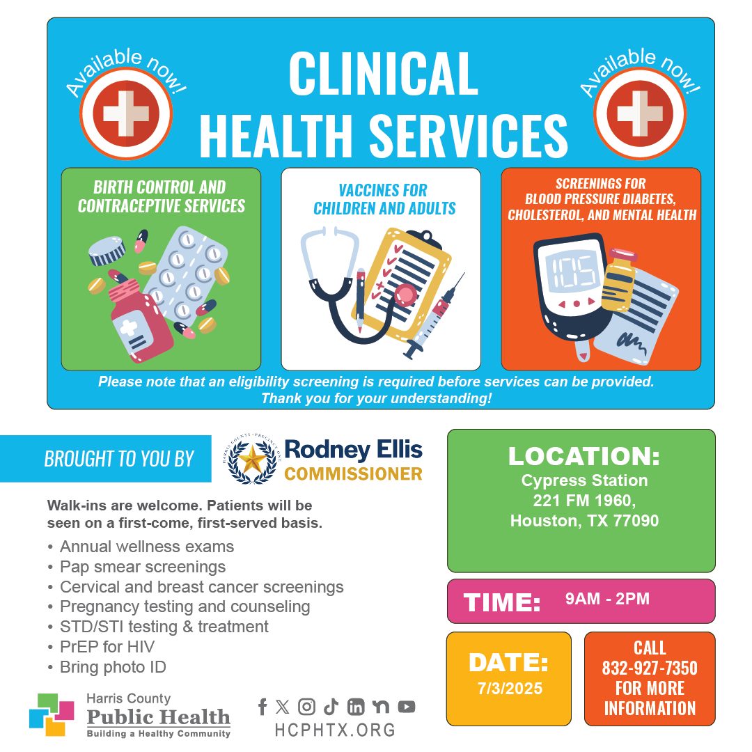 El Departamento de Salud Pública del condado Harris junto al comisionado del distrito 1, Rodney Ellis, organizan para la comunidad servicios gratuitos de salud. Está destinado para pacientes de todas las edades. Se proveerá sobre salud reproductiva, vacunas, exámenes de sangre, colesterol, etc. Se atenderá por orden de llegada. Es necesario contar con identificación.