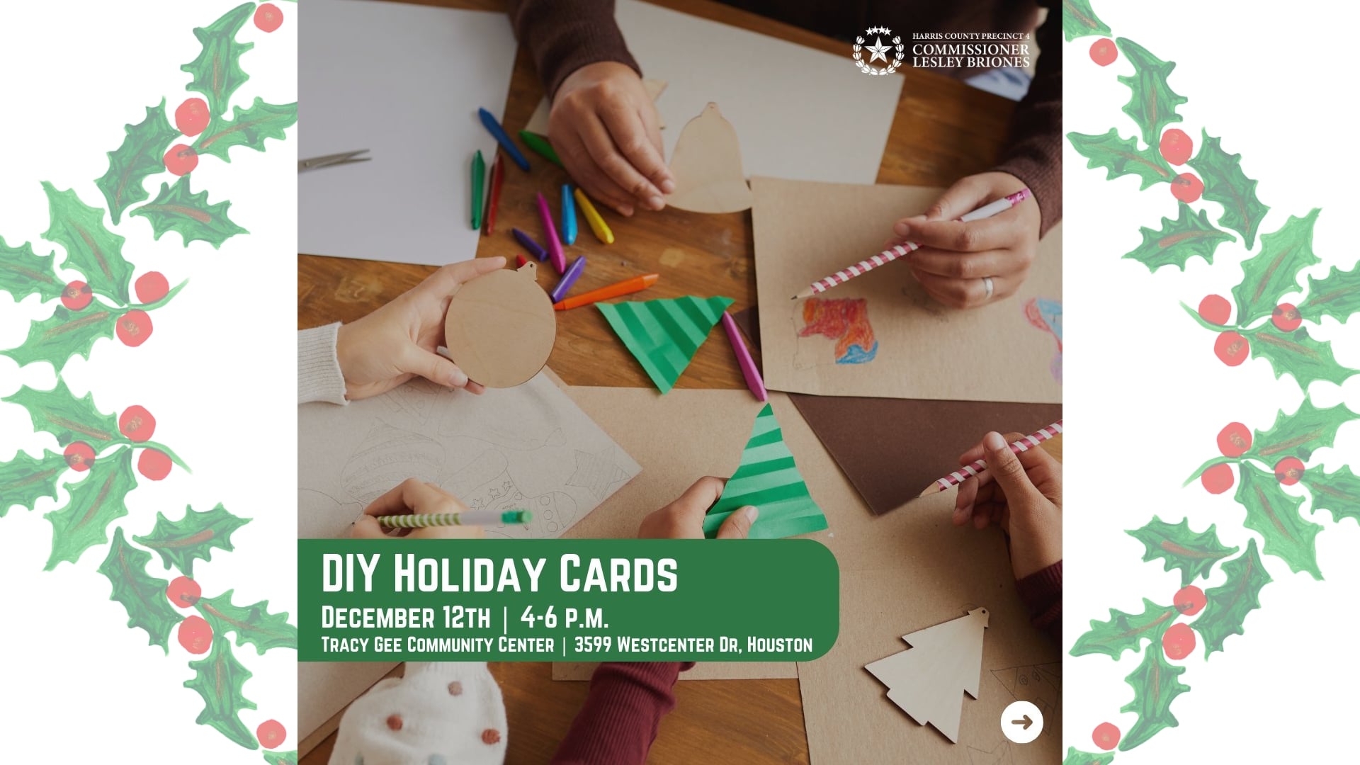 Tracy Gee Community Center 3599 Westcenter Drive, HoustonActividad para la familia o entre amigos al estilo DIY (hazlo por ti mismo) para crear sus propias tarjetas navideñas o también para año nuevo. Evento en inglés.